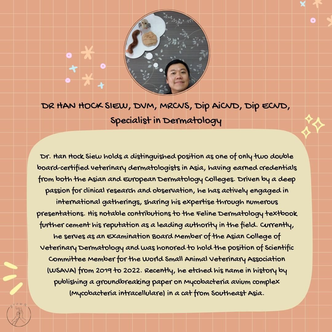 Dr. Han Hock Siew holds a distinguished position as one of only two double board-certified veterinary dermatologists in Asia, having earned credentials from both the Asian and European Dermatology Colleges. Driven by a deep passion for clinical research and observation, he has actively engaged in international gatherings, sharing his expertise through numerous presentations. His notable contributions to the Feline Dermatology textbook further cement his reputation as a leading authority in the field. Currently, he serves as an Examination Board Member of the Asian College of Veterinary Dermatology and was honored to hold the position of Scientific Committee Member for the World Small Animal Veterinary Association (WSAVA) from 2019 to 2022. Recently, he etched his name in history by publishing a groundbreaking paper on Mycobacteria avium complex (Mycobacteria intracellulare) in a cat from Southeast Asia.